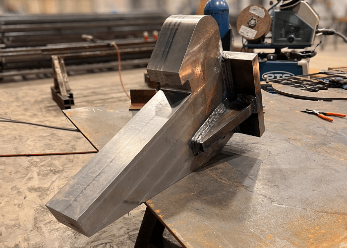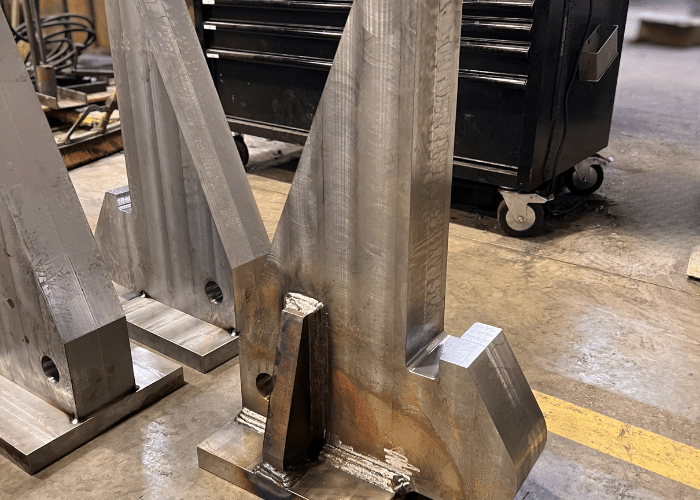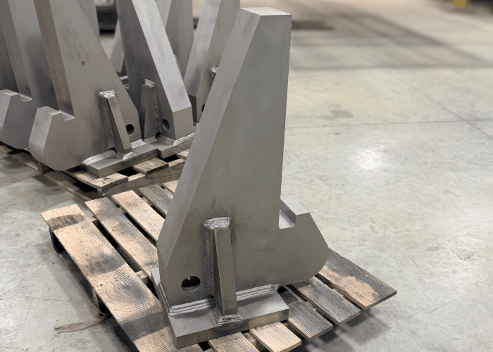 Our team managed the entire process in-house—combining fabrication and precision machining on our horizontal line boring machine, followed by sandblasting and powder coating. The result: durable locking brackets built to perform in demanding manufacturing environments.