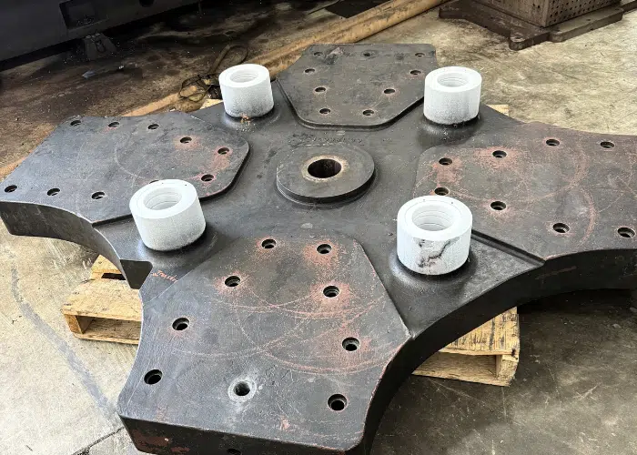 This ejector plate came from a high-volume injection molding machine that had been in service for many years. Over time, the guide rod bores wore
